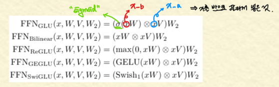GLU Variants Improve Transformer를 소개하는 이유가 굉장히 명확합니다. 바로 이 논문을 기반으로 현재는 Transformer의 activation function의 trend가 바뀌었기 때문입니다.